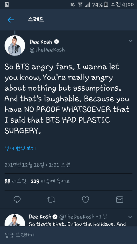 Dee Kosh란 사람이 '걔네 성형했잖아요'라는 식으로 허위사실 유포함;..