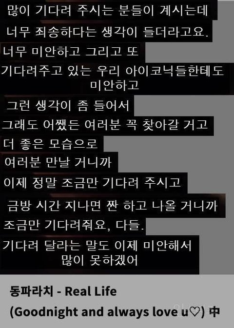 아이코닉들아 1월에 컴백을 할지 안할지 잘 모르겠지만 만약 한다면 우리 진짜 스밍도 열심히 하고 애들 행복하게 만들어주자. 김한빈 김진환 김지원 송윤형 김동혁 구준회 정찬우 아이콘 우리 천천히 오래가자.