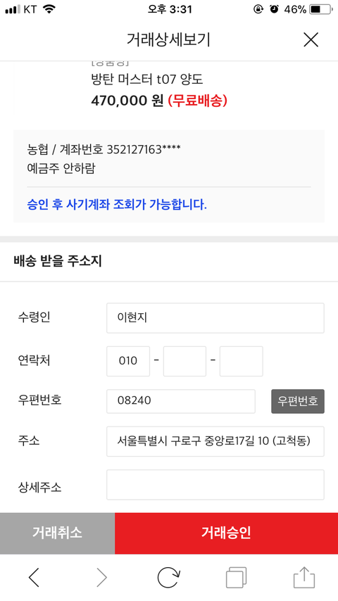 거래를 승인해야 계좌번호랑 번호를 볼수 있나봐 근데 여기에 번호나 주소 아무거나 적어도 돼? 이거 어떡해 ..