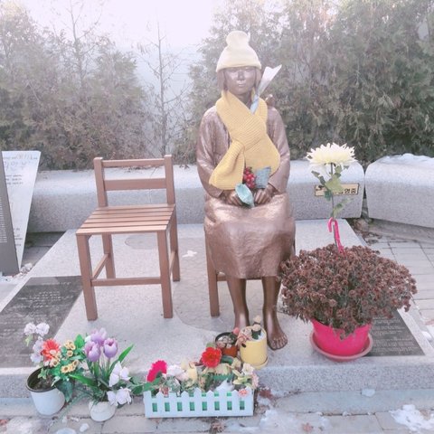 오늘 여행와서 시내에 잠깐 들렸는데 사람들이 소녀상이 추울까봐 비니랑 목도리를 덮어주고갔나봐요 ( ´ ▽ ` )ノ 아직은 살만한 대한민국인가봅니다..ㅎㅎ 꽃만 놓고가는것도 힘든일일텐데 .. 위안부 피해자 할머님들 일본에게서 제대로된 사과를 받았으면 좋겠습니다ㅠㅠ (ノД`*゚)゚・:。.