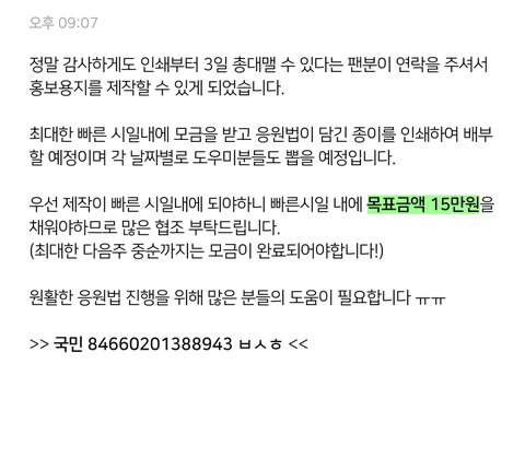 응원법 수정계정분이 본인은 곤란하다고 혹시 맡아서 할사람 없냐고 했는대 총대할사람 나타났대. 시간이 얼마 안남아서 빨리 진행해야하나봐. 토기들 중에 여유있는 토기들은 도움주면 좋을것 같아서. 물론 나도 조금 입금할려고
