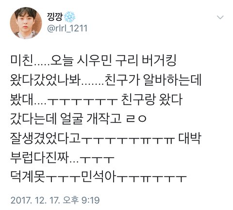 빵이랑 햄버거 좋아하는 민석 너무 귀여워ㅋㅋ 이렇게 옴뇸뇸뇸 하고 먹었을것 같아