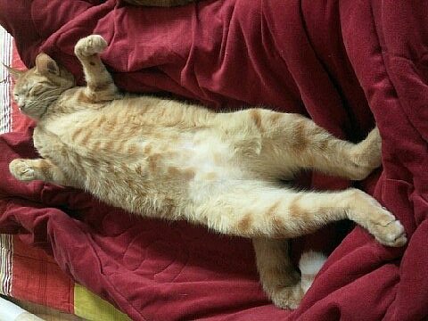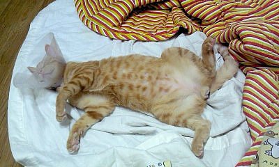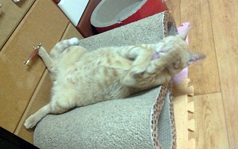 실컷 장난감으로 놀고 지친 로이는 뱃살이 최고 편한 자세를 취했습니다.