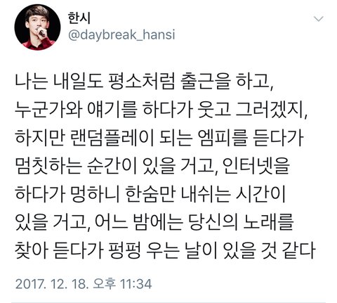 내가 너무 공감이 됐던 글... 내일이면 다시 어제처럼 살아가겠지 그리고 문득 당신을 떠올릴 순간이 있을테고. 갑자기 당신을 떠올렸을 때 좋은 기억밖에 없다고, 너무 고마웠다고, 당신은 내 희망이었다고 전해주고 싶다