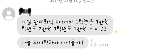 안녕하세요 충정로학교다니는 학생입니다. 다름이 아니라. 보컬 선배님들중에서 개념을 상실한 사람들이 있어요 사진에 보면 1학년이3만원 2학년이2만원 3학년이 1만원입니다 이건 말도 안되는게 우리한태 말도없이 갑자기 통보하고 1학년들은 20살이 많은데 솔직히 3만원은 큰돈이지요 이런걸 너무 당연하게하고 지들끼리 술을 쉽게 먹을라고 1학년들한태 돈을더 많이네라고 하는것같습니다. 이런 개념상실한 사람들은 어찌해야될까여?
