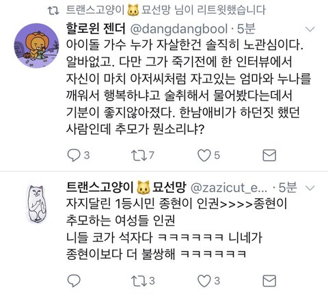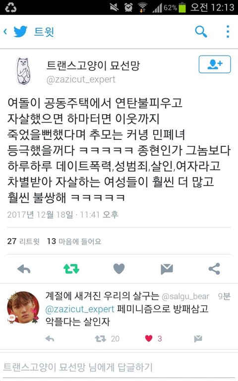 완전 미친거 아니야?? 페미니즘을 방패로 죽은 사람에게 악플을 달고있네 ㅋㅋㅋㅋㅋㅋㅋ 와 어이가 없다 진짜 이게 쟤네가 말하는 평등과 자유야? 저렇게 해서 여권을 상승시켜??