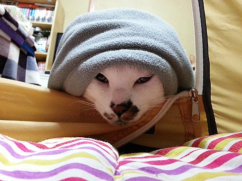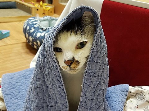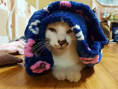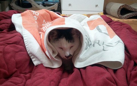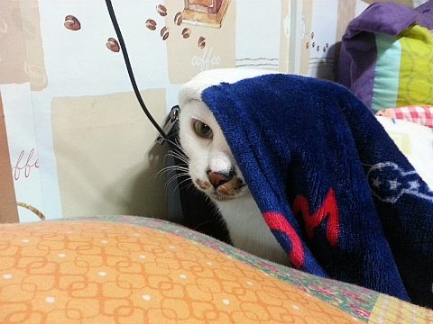 프로는 도구를 가리지 않죠. 바스 타월도 이부자리로 손색없나 봐요.