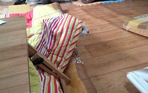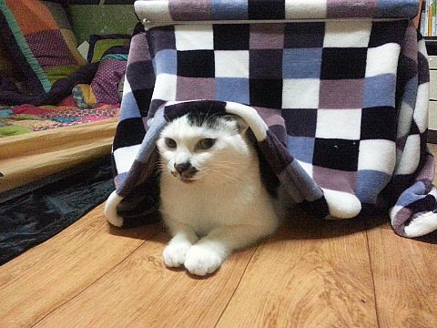 이불을 뒤집어쓴 게 스핑크스 같은 느낌이네요.