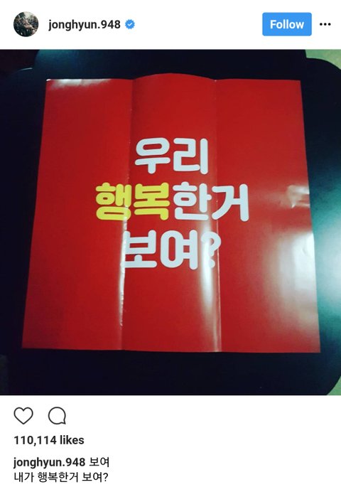 몇일전까지만해도 보여? 나행복한거보여? 라는말이 '나 지금 행복한데 보이지?' 라는건줄 알았는데 이제보니 '나도 안보이는 내 행복이 보인다고?' 하는 뜻으로 해석된다 종현아 너무 미안해