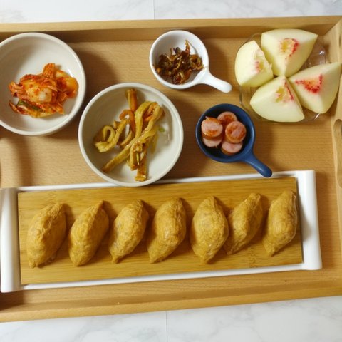 이건 제가 프리로 일하는중이라, 출근하는날이었어요. 남편은 연차였구요!ㅎㅎ유부초밥 해주었어요. 반대로 놨어야하는데...ㅎㅎ저는 햄에 양파볶아서 밥위에 놓구요, 추가로 굴소스 조금 넣어줘요. 감칠맛돌아서 맜있어요!
