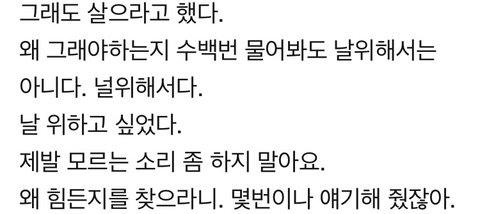 자살 하려 하면 맨날 "부모님 생각해" , "주변 사람들 생각해" 하는게 대부분 이잖아. 자신을 위해서 그랬다는 게 더 슬프다...