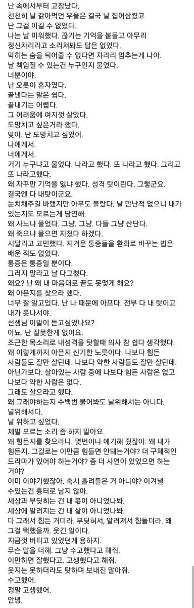 글 읽으면 나와 또 다른 나. 유서 읽으면 종종 기억도 잃었다는데 지금까지 버텨준 게 너무 고마워. 내가 만약 저 상황이라면 얼마나 오래 버틸 수 있었을까. 라는 생각도 들고. 진짜 수고했다고 너무 고생했다고 전하고 싶다.