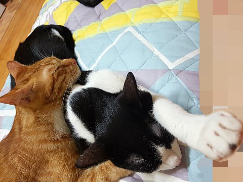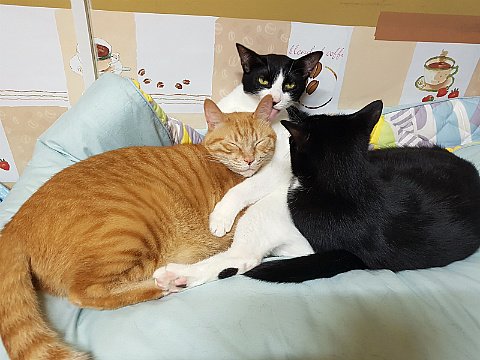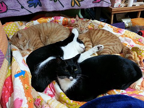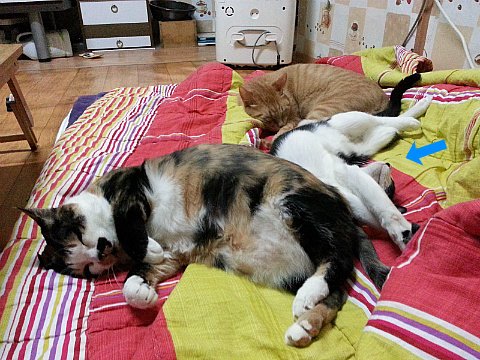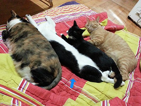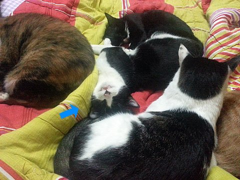 고양이들이 뭉쳐서 잘 때는 야무진 포즈를 취하지 않으면 주위 고양이한테 폐를 끼쳐요.