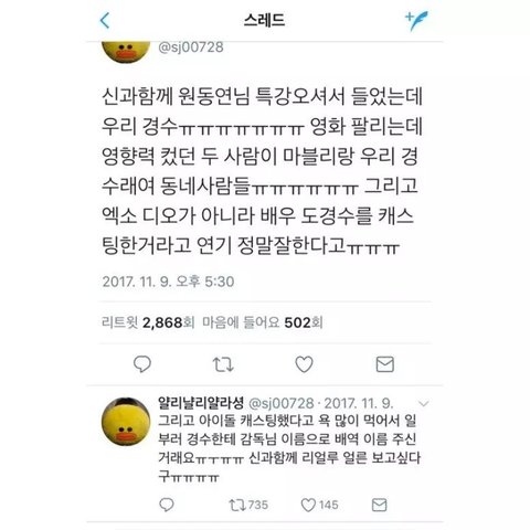 아이돌 캐스팅으로 욕 마니 먹어서 일부러 경수 배역 이름 자기 이름으로 햇다는 거... 그만큼 경수 연기력 믿으신거겟징