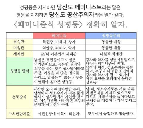 페미식 성평등과 사람들이 일반적으로 알고있는 성평등은 다름. 나도 이제 페미라고 안하고 그냥 성평등주의자라고 함. 헐리우드에서 성평등활동으로 유명한 배우 메릴스트립도 자기는 페미니스트가 아니라 휴머니스트라고 했었지