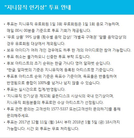 -지/니/뮤/직 인기상(2017.12.11 14:00~2018.01.05 18:00)