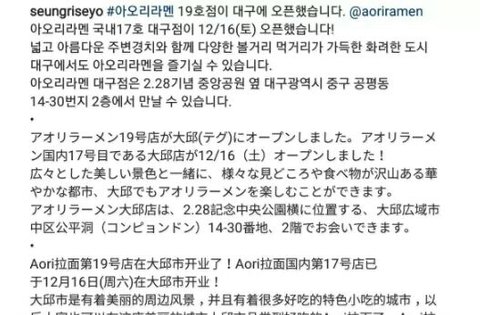 승리가 아오리라멘 대구점에 오픈한거 인스타에 올렸는데