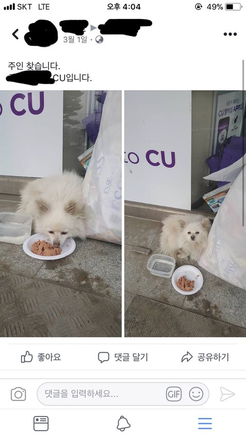 sns보다가 이런글이있는거에요 그래서 빨리 택시잡고 갔습니다 직접봤는데 심각했어요 엄청말랐어요 빨리집가서 사료주고 씻겨야겠다 하는생각으로 씨유주인분께 허락맡고데리고갔어요 (제가 데리고간거는 키울려고한게아니라 주인찾을때 동안만 맡을려고한거에요)