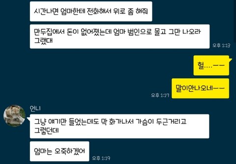 엄마-그얘길왜저한테하시는거죠?.. 그래서 몇일전부터 가게분위기가 이랬냐고, 그럼 처음부터 물어보시지 상황다정리되고 결론은 저라고생각하시고 말씀하시는거에요? 계산할때실수를했었어도 1,2만원 액수차이나는것도아니고 45만원이라는 금액을 제가 빼갔다는게 말이되나요..?