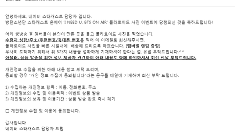 내가 네이버 아이디 생성하고 한번도 메일 정리를 안해서 ㅋㅋㅋㅋㅋ큐ㅠㅠㅠㅠㅠㅠㅠㅠ 오늘 날잡고 메일 정리하다가 이 메일 온걸 지금 봤어.... ㅠㅠㅠ 지금 답메일 보내도 안주겠지^^..... 하 울고싶다 이런거 당첨된 적 한번도 없는데 ㅠㅠㅠㅠㅠㅠ
