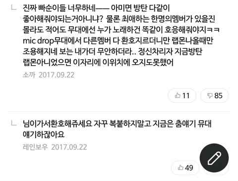 일단 마이크드롭 최초공개영상 댓글인데 그 베플...알다시피 좀 개인칭찬만하는 베댓이 많이 올라갔었잖아..그런 댓글 중 하난데 진짜 딱봐도 어그로인 댓글에 ㅂㅁㄱ하면 되는걸 가지고 춤이랑 무대 얘기한다면서 남준이 후려치는거..ㅋㅋㅋㅋㅋㅋㅋㅋㅋㅋㅋㅋㅋㅋㅋ심지어 무대호응이 작은것도 아니었는데 거기에 말려서는ㅋㅋㅋㅋㅋㅋㅋㅋ..여기에 추천은 50가까이되면서 반대는 10도 안됨...아 너무 속상하다 저런 어그로 댓글에 저렇게까지 발끈해야만 했을까