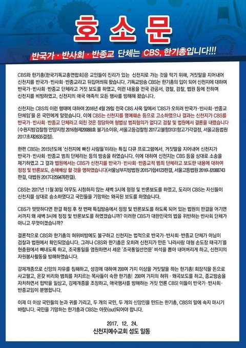 국민들의 눈과 귀를 가리고, 두 개의 국민, 두 개의 신앙인을 만드는 반국가·반사회·반종교인 한기총, CBS의 말에 더 이상 속지 마시기 바랍니다.
