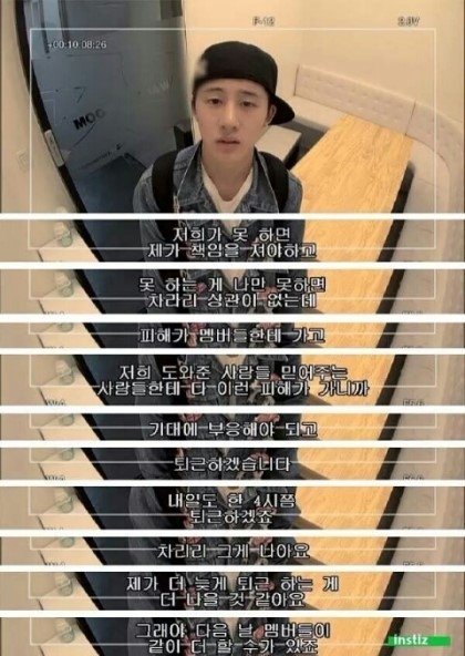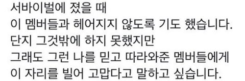 몇년동안 함께 연습생 생활을 해왔고 서바이벌을 2번이나 하면서 멤버들은 지금 가족처럼 애틋해. 가끔 찬우가 왕따를 당한다느니 리더가 멤버들을 막 대한다느니 이상한 얘기들이 많은데 사실이 아님을 알아줬으면 해.