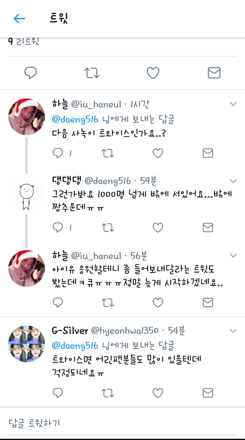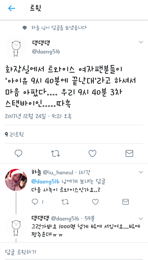 내 친구도 여덕원스인데 추워죽겠다고 톡으로 도배함ㅠㅜㅜㅜㅜ진짜 아이유 노래 다 알고 응원할수있으니까 제발 들여보내달라고 막 그러는데 맴찢ㅠㅠㅜ지금은 들어갔다는데 연락이 없네