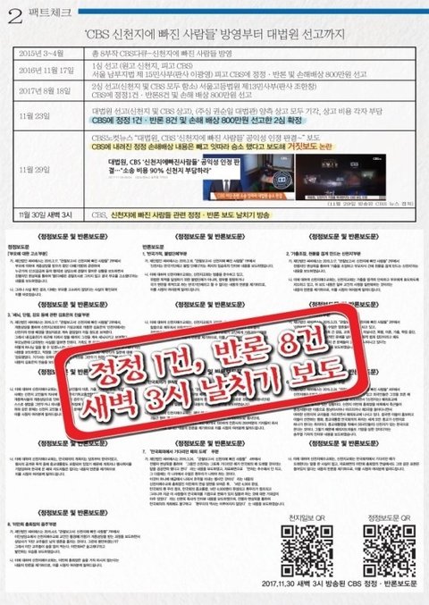 이에 신천지는 CBS를 상대로 소송을 제기했고, 그 결과 법원은 CBS에게 신천지에 대해 정정 및 반론보도, 손해배상 판결을 내렸으나 법원의 판결에도 여전히 CBS는 자신들이 승소한 것처럼 왜곡된 보도를 하고 또한 법원의 판결에 따라CBS는 지난 11월 30일 정정?반론보도문을 내보냈으나!!!