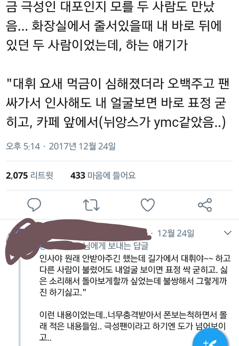 대휘 사생 대처 잘 하는 것 같아 워너블이 적극적으로 해결 못 해주는 건 슬프지만ㅠㅠ 우리는 무대에 서는 대휘 많이 사랑해주자