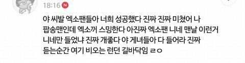 야 너 엑소엘이잖아 ㅋㅋㅋㅋㅋㅋㅋ 너 그 짬밥사건때도 머글이라면서 엑소엘 편 들다가 엑소 0도 인증 하다가 이젠 79도 됐네 ㅋㅋㅋㅋ 12월 6일에 쓴 글일 땐 0도다가 한달도 안됐는데 79도 됐네 ㅋㅋㅋㅋㅋㅋㅋㅋㅋㅋㅋㅋㅋ 진짜 머글 코스프레 오진다