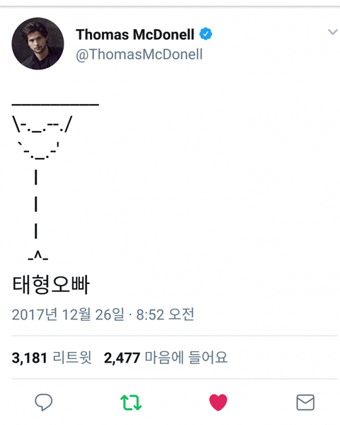 평소 한국 좋아해서 한글로 트위터하는 배우인데, 이런 포스팅을...바로 다음 포스팅이 SBS 가요머전 전광판 이야기하는 걸 보면,가요머전보고 태형이한테 반했나봐..저기.... 지금 아미 선언하신거 맞죠? ㅋㅋㅋ