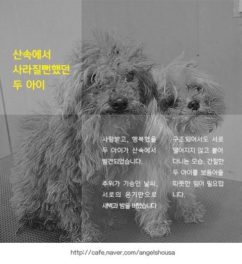 아이들에게 다시 희망이 찾아올까요?토리와 아롱이라는 이름을 얻고서아이들의 비참한 모습에서 느껴지는 많은 것들. 가려운 피부를 긁는 분주한 아이들의 모습. 그틈에도 사람을 쫓아와 앙칼지게 짖으며 손길을 주길 바랍니다. 설명할 수 없이 아픈 날이 많았을 아이들에게 새로운 삶이 있으려면 변해야 하고 바뀌어야 합니다.