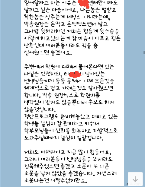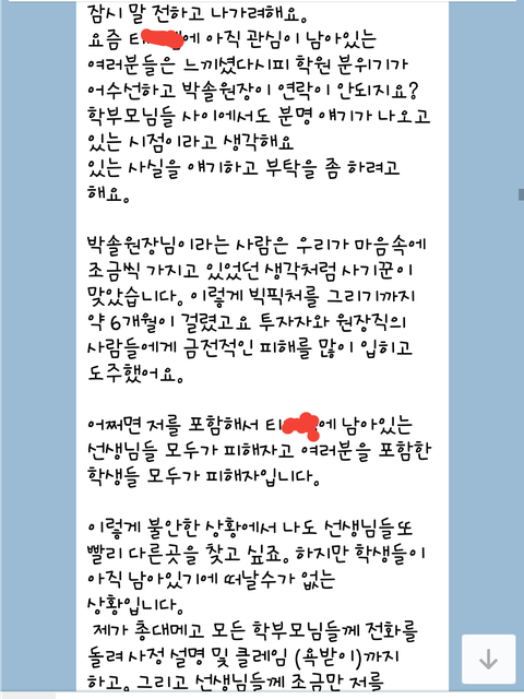 공부를 워낙 안한지라 고3때 친구가 오지는 선생님 왔다는 말에 홀려 학원을 다님. 새로오신 쌤이름이 박 솔이고 부원장으로 왔기 때문에 박부라고 불림. 여하튼 내가 학원을 들어갔을때는 고3이 6명이 끝이었음.박부는 우리한테 엄청 잘해줬고 자기돈을 아낌없이 우리한테 베풀었음. 꿀발린 입으로 우리에게 대학은 자기가 책임진다우리아들이랑 아내는 독일에 산다는 등 자신의 인맥또한 과시했지. 이런거에 속아넘지 않는게 이상할 정도였음. 내가 학원다닌게 3월달이었는데 6월달쯤 박부가 a동옆에있는b동에 t**마스터**이란 학원을 만들면서 자연스레 내가 다니던 학원도 이름이 바뀌었지.그러더니 친구들 모아오라고 하면서 인원은 순식간에 20명정도로 늘어났음. 그대로 잘 학원생활 하다가 8월달쯤에 박부가 원장쌤이랑 얘길하더니 자기가 원장자리 물려받고 광교 평촌 등등 학원을 계속세우더니 수능100일 전부터 1대1을 멘토링 시스템을 시작할테니 4달치 수업비 400을 내라고 하고는 광교에만 있고 우리한텐 미안하다고만 하더니 수능이 끝난지금 일주일 전 부터 휴대폰이 꺼져있음.그러곤 오늘 다른선생님으로부터 연락이옴(사진참고)빨간색으로 지운건 학원 이름이에요