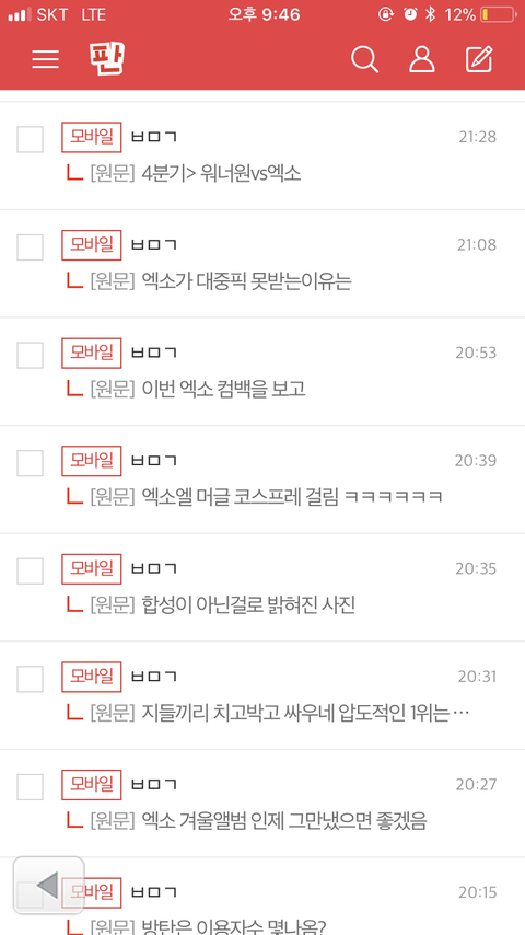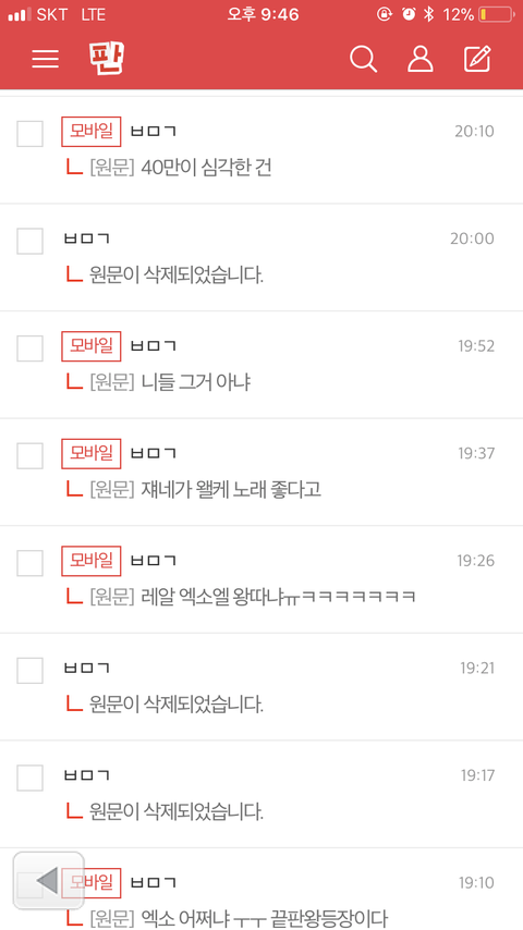 나 하루 종일 ㅂㅁㄱ 달고 다녔다 ㅇㅌ에서 근데 정말 구라 안 치고 나 저렇게 ㅇㅌ에서 하루 종일 이용자수며 5분 차트며 멜롱 제외 다른 음악 싸이트 차트까지 다 가지고 와서 하나하나 다 지켜보는 거 처음 봤고 ㅉㅂ 때처럼 건수 걸렸다고 타가수들 성적 욕 먹은 거 다 우리가 했다고 부메랑 이 지랄 떨면서 개욕먹는다 근데 나 ㅂㅁㄱ 하고 다니면서 멘탈 깨지는데 너네 거의 없더라 까글에 추천이 훨씬 많아 그냥 난 이제 모르겠다 더 이상 가기도 싫고 스트레스만 받아