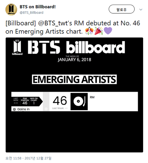 빌붜~드 이머징차트에 아티스트 부문 46위로 데뷔함 ㅠㅠㅠㅠㅠㅠㅠㅠㅠ