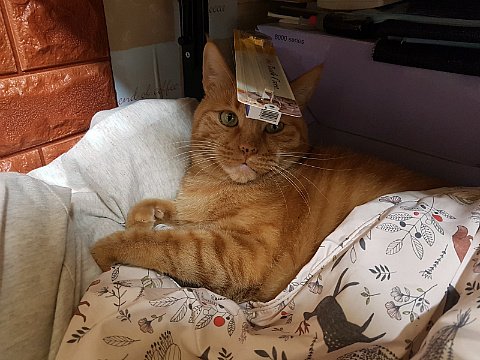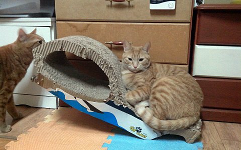 사진에 보이는 로이의 무게로 한껏 기울어진 불쌍한 스크래처는 돌고래의 형상을 하고 있었거든요. 전생에 파쇄기였다가 고양이로 태어난 녀석이 있는지 아주 너덜너덜하게 해놨어요. 지난 글을 읽어보시면 엉망으로 뜯어져서 테이프를 덕지덕지 붙여놓은 스크래처를 보실 수 있습니다.