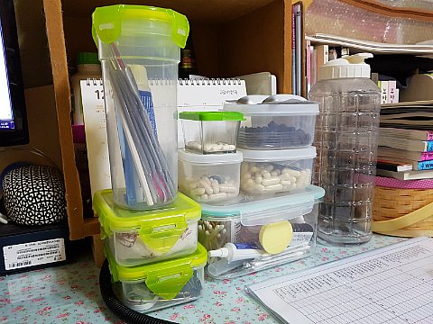 누워서 스마트폰을 만지작거리는 저입니다. 항상 왠지 병간호하듯이 몰려있는 녀석들.