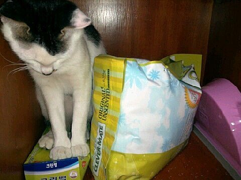 고양이 배변 모래로 고민하신 분들은 아시는 브랜드일 거예요. 저한테는 꽤 고가에 속하는 모래거든요. 모래가 아주 고운 편이라서 작은 구멍에도 모래가 솔솔솔 세는데. 어느 날부터 자꾸 뜯어져서 청소하고 테이프 붙이고를 반복하다가 범행 현장에서 범묘를 검거한 사진이에요. 쵸이였지요. 이 날 이후부터는 모래는 고양이들이 접근하지 못 하는 곳에 보관하고 있어요.