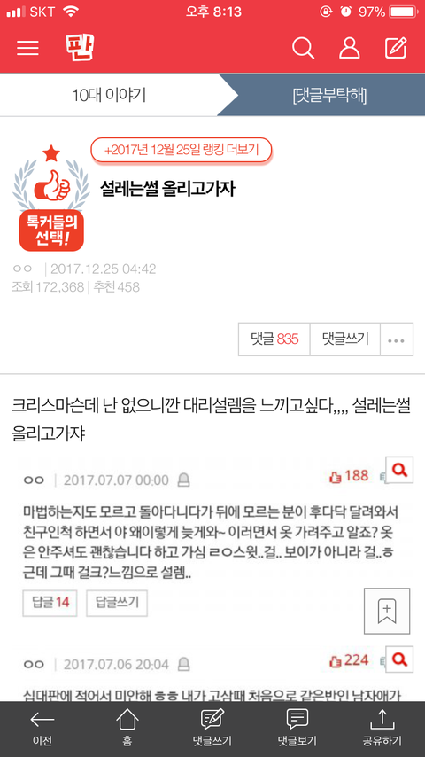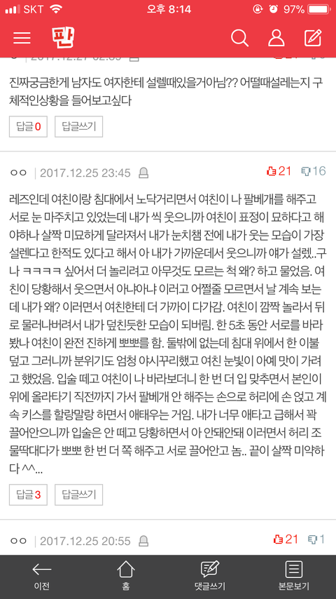 설레는 썰이나 야한 썰은 차곡차곡 모아서 나에게 카톡 보내기로 보내놓는단 말임 ㅌㅋㅋㅋ 가끔씩 정주행 하려고. 오늘 낮에 랭킹순으로 쫙 보는데 ... 읭?