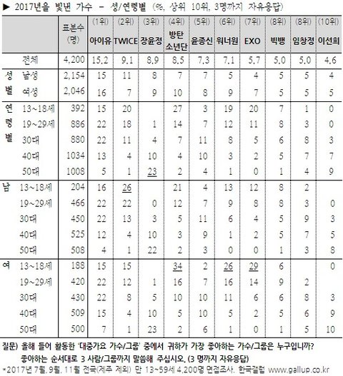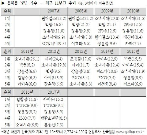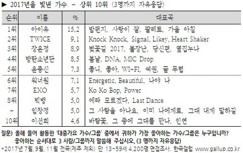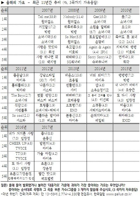 2017년 12월 19일 드디어 갤럽의 올해를 빛낸 가수와 가요가 발표됨.
