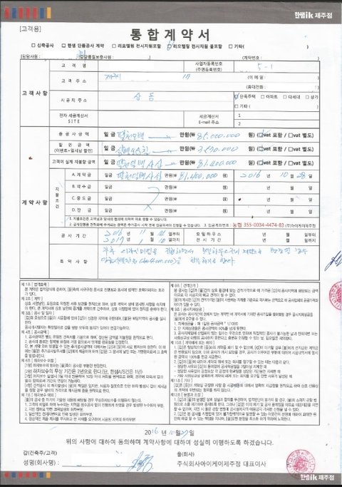 (계약자 남편 정보와 직원, 대표이름만 가리고 계약서 스캔본입니다.)