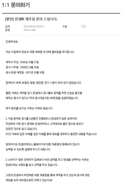 [1차 한샘 고객센터 문의/답변 2017년 09월 28일]