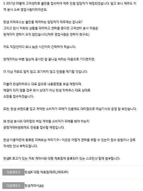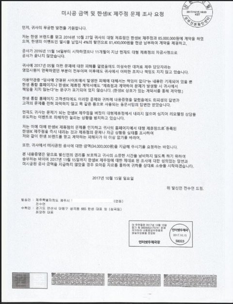 -2017년 06월 한샘 본사 마케팅팀으로 한샘IK제주점의 상황의 문제를 제기하고 피해자가