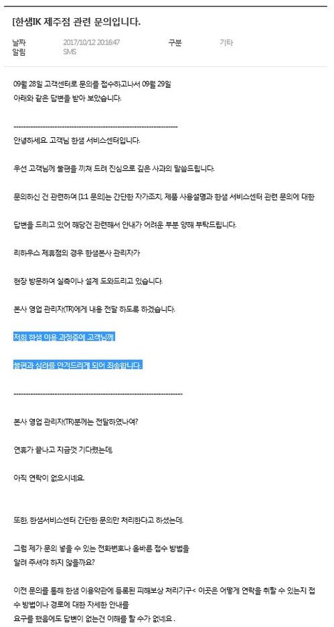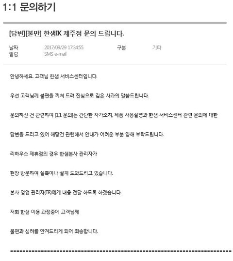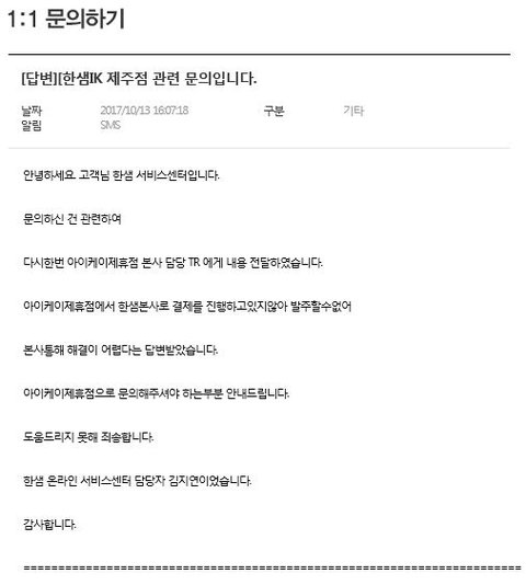 [2차 한샘 고객센터 문의/답변 2017년 10월 12일]