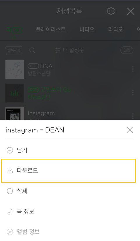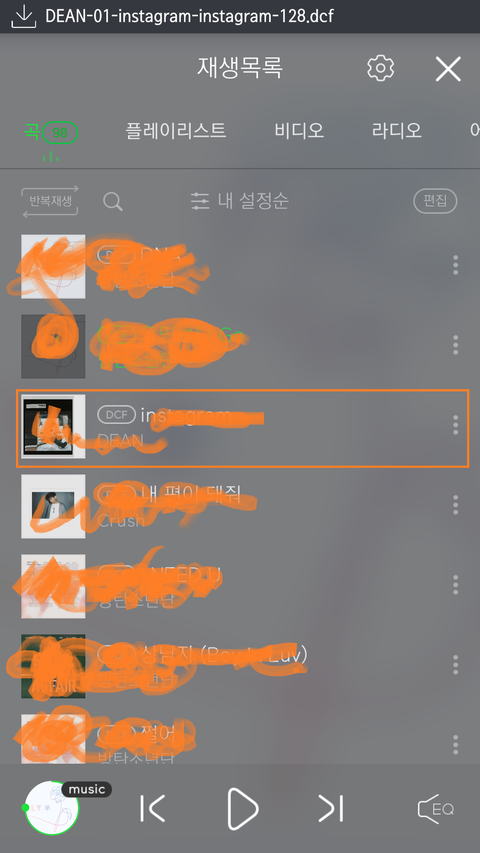다운로드 클릭하기전에는 노래제목 앞에 DCF 라는 표시가 없음.