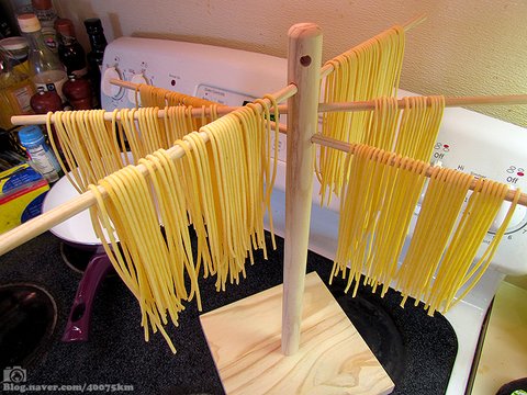 밀가루 반죽을 잠시 숙성시켰다가 기계로 뽑아낸 후, 이렇게 건조대에 빨래 널듯 말려줍니다.