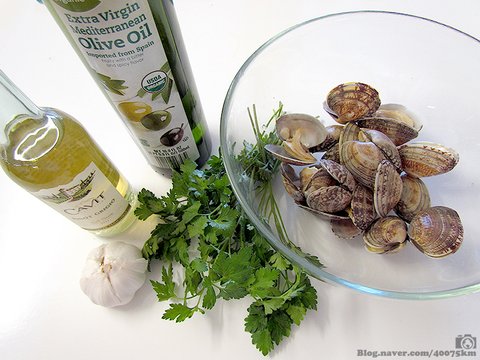 준비물은 올리브유, 마늘, 파슬리, 화이트 와인, 그리고 조개입니다.
