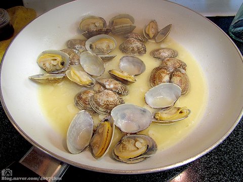 어떤 조개를 사용하느냐에 대해서는 의견이 분분한데, 우리나라에서는 대부분 모시조개 내지는 바지락을 사용합니다.