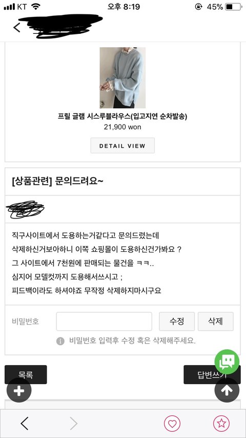 하지만 제 문의를 삭제하였고 화나는마음에 하나 더 남겼습니다 ㅠ